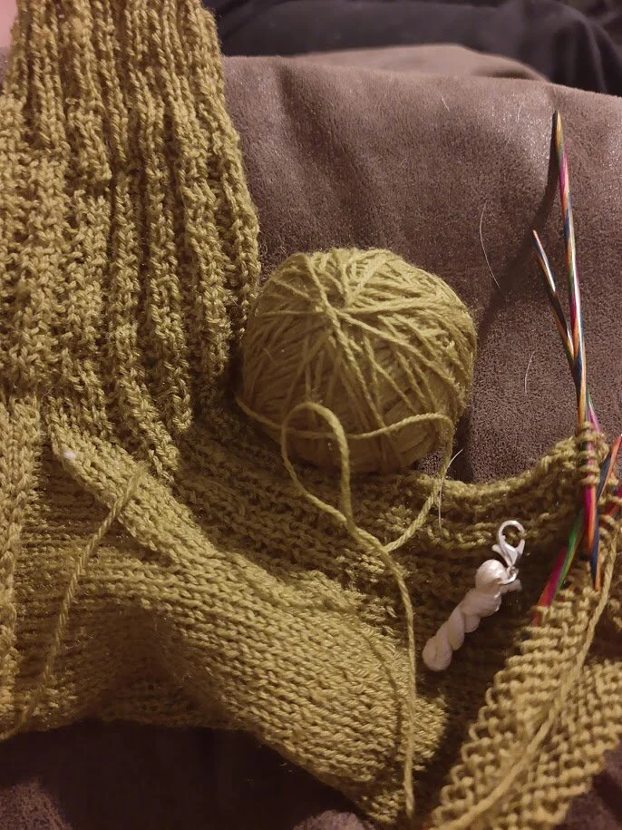 I used MillaMia Naturally Soft Sock in the colourway herb. Overall, I like this yarn. It’s quite soft, yet still feels sturdy. It’s 75% wool, 25% polyamide. I think it’s interesting it’s not superwash wool, but I tend to hand wash our knit socks anyway. I also found it a bit on the thinner side of sock yarn. It’s also important to note it comes in 50g balls. I like a short sock, but Adam prefers a longer leg. I bought two skeins and have lots of yarn left for my beekeeper’s quilt. In the two skeins, I found one knot.