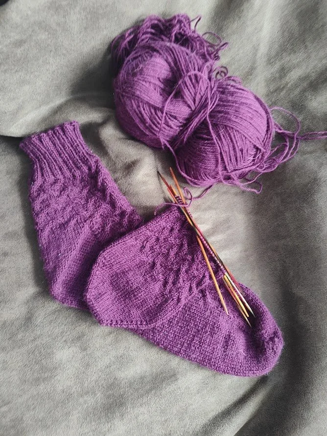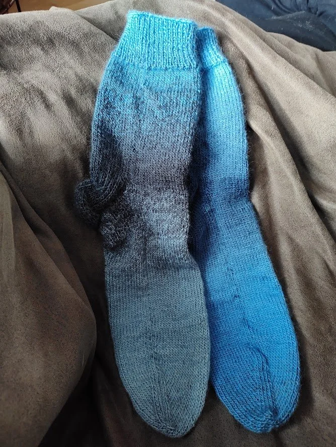 I made him the first set in some stash yarn for Christmas and didn’t get a picture before he wore them and immediately stepped in chocolate. Fab. Those were a worsted weight cuff down, heel flap and gusset pair that I will be cleaning and photographing on my next handwash cycle. Pictured are the top down in fingering weight. I made these in Schoppel Wolle Zaeurball 100. I don’t know if these are the best for socks as the merino is really fine, but I added in extra length and I’m prepared to darn if needed.