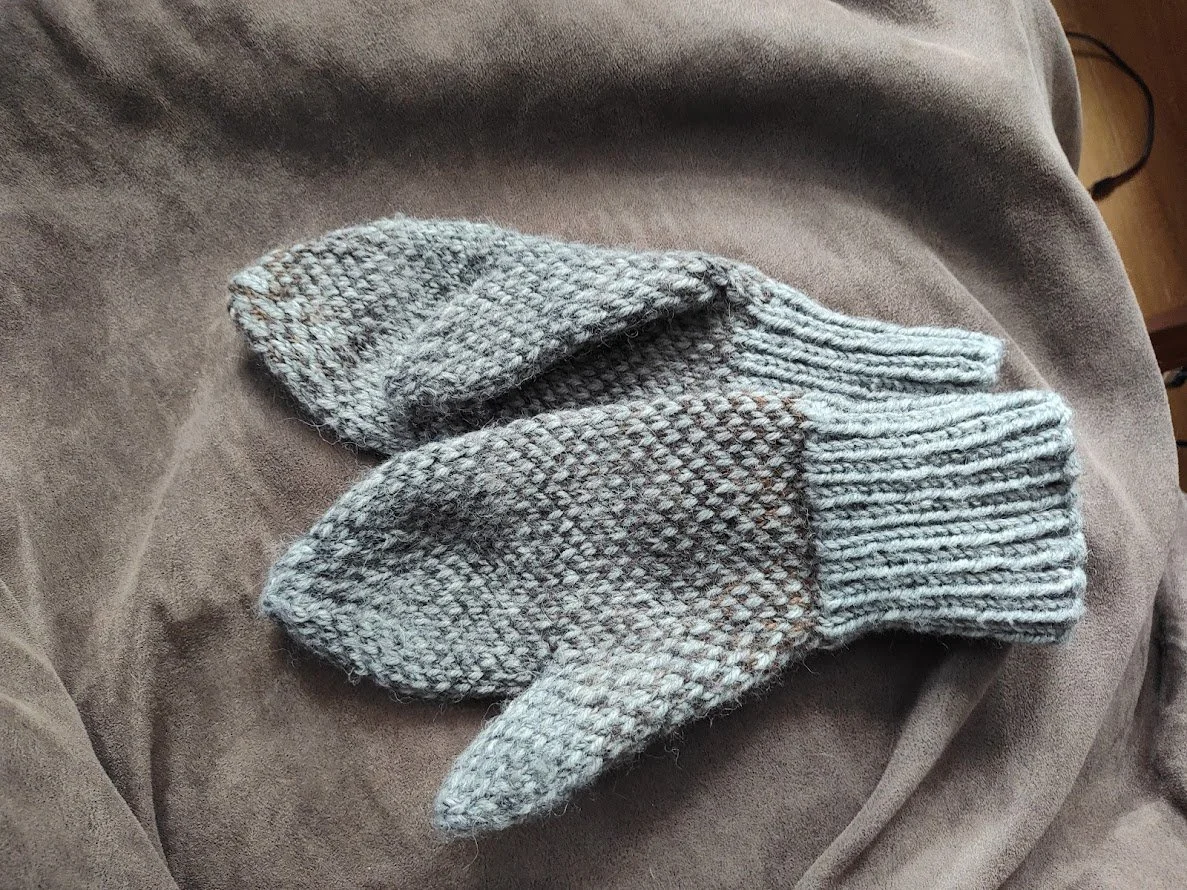 This one was finished a while ago. Winters here are a bit more intense than either of us had ever experienced and my poor Australian husband was struggling. I looked through my stash and found a skein of Morris and Son’s yarn that we got on our honeymoon. I think they might have discontinued it. I also found a skein of random unlabelled wool that I definitely got in Cork but can’t find it so it must be discontinued as well. I ended up doing one stitch of each and made a very thick, super warm mitt that he loved wearing all winter. I had made a few pairs of mitts before but wanted a bit of guidance so I found a class on Craftsy- My First Mittens and Gloves. I really enjoyed it and the mitts turned out well. I found some stash DK and think I might make the gloves for myself because, well, I deserve it, don’t I?